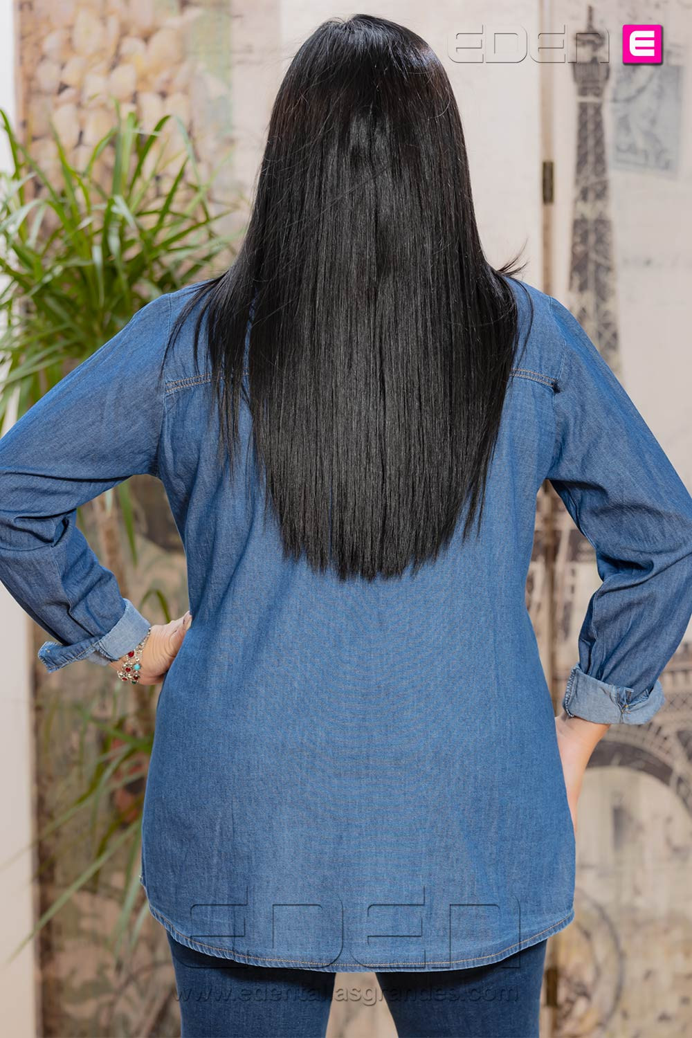 Su diseño cómodo y favorecedor, con corte pensado para tallas grandes, ofrece una caída fluida que estiliza la silueta sin perder libertad de movimiento. El contraste entre lo casual del denim y la suavidad de las flores la convierte en una prenda versátil, perfecta tanto para el día a día como para ocasiones informales.
