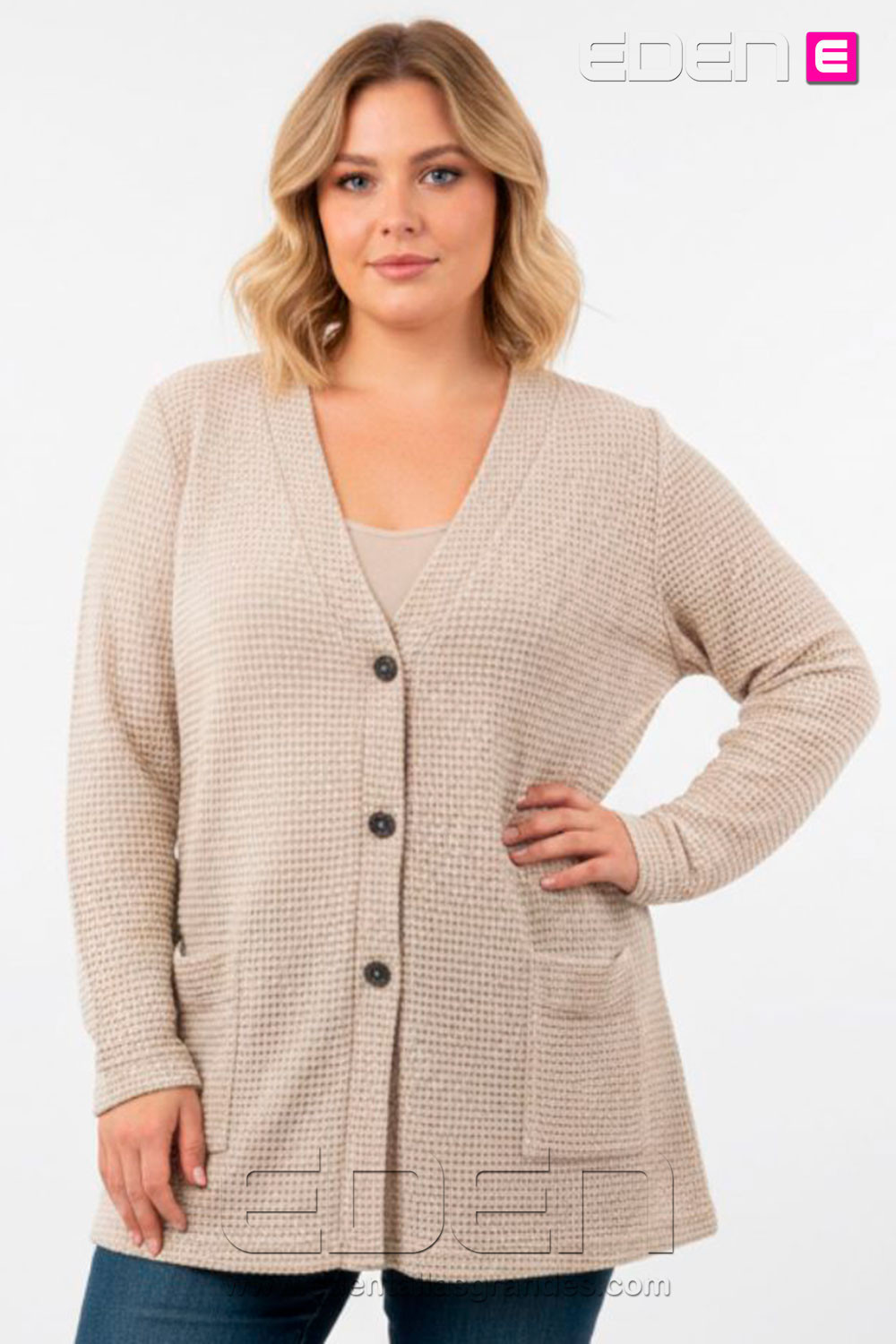 Chaqueta Indra: Punto calado ligero en beige con tres botones y bolsillos delanteros. Corte recto y cómodo en tallas reales. ¡Estilo y confort diario!