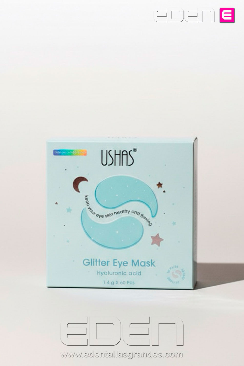 EDEN BEAUTYLa mascarilla de ojos con ácido hialurónico y glitter de la marca Ushas, presentada en caja de 60 unidades, es un tratamiento ideal para cuidar la delicada zona del contorno de ojos.
