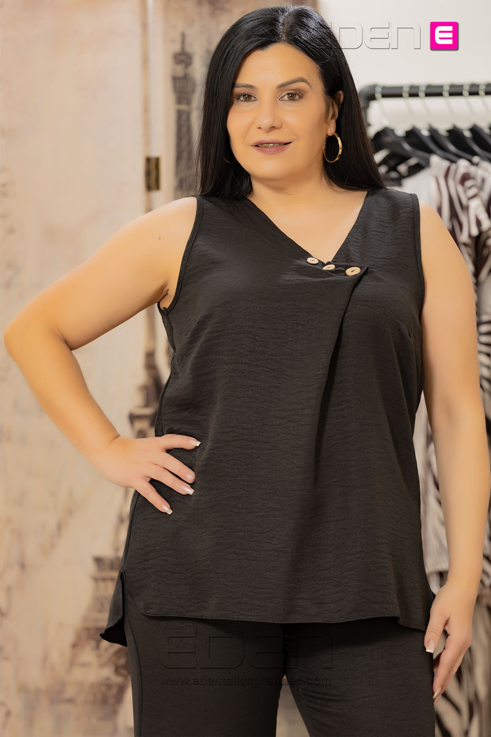 Top modelo Huesca de Con Alma en color negro, confeccionado en tejido suave y ligero que ofrece comodidad y caída natural. Su diseño favorecedor incluye detalles elegantes en el cuello, aportando un toque femenino y versátil.